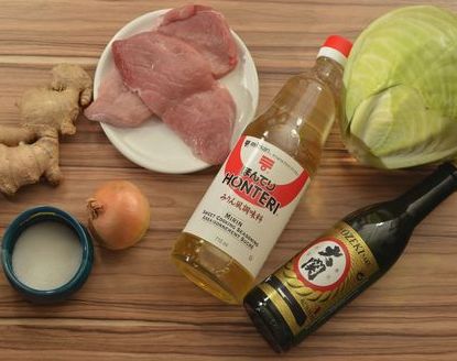 Zázvor s cibulí nastrouháme na jemno a smícháme s mirinem, sake a lžičkou cukru.