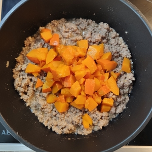 Jakmile je dýně měkká, slijeme vodu a pokrájíme ji na menší kousky. Pak dýni přidáme k opečenému masu a vše dochutíme česnekem, rybí omáčkou, sezamovým olejem s chilli a lžičkou cukru. Společně ještě chvilku prohříváme, aby se chutě správně propojily.