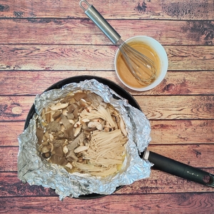 Zhruba po čtvrthodince alobal rozbalíme a k houbám vlijeme připravenou omáčku. Znovu uzavřeme a necháme dusit ještě cca 5 minut, aby se všechny chutě propojily.