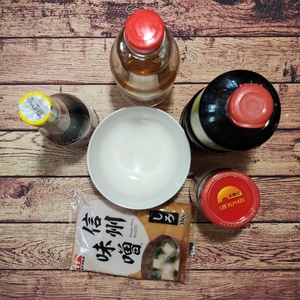 Teď si připravíme omáčku - doubanjiang, mirin, ústřicovou omáčku, sójovku a miso společně vymícháme do hladka. Od každého odměříme 1 až 2 lžíce.