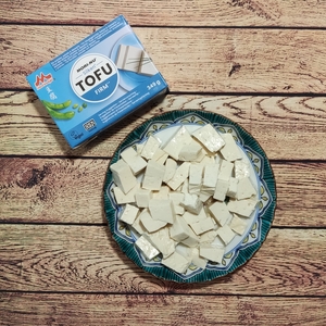 Celé balení pevnějšího tofu nakrájíme na kostičky.