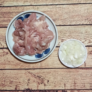 Cibuli oloupeme a nakrájíme najemno. Kuřecí stehenní řízky očistíme a nakrájíme na menší kousky.