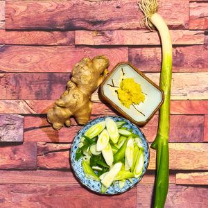 Začneme zázvorem a cibulkou. Jarní cibulku očistíme a nakrájíme na šikmé plátky. Kousek zázvoru oloupeme a nastrouháme najemno.