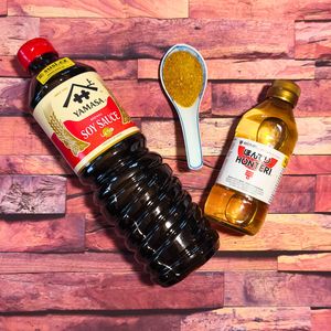 Zároveň s tím dáme vařit vodu na nudle a pustíme se do zálivky - ve vhodné misce smícháme 3 lžíce sójovky, 3 lžíce mirinu a 1 lžíci cukru.