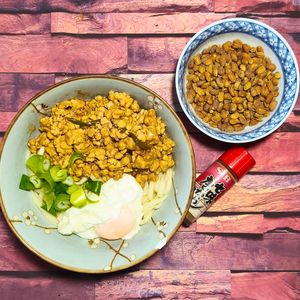 A můžeme servírovat - do hluboké misky dáme nudle udon, na ně maso s omáčkou, zastřené vejce a jarní cibulku. Pikantnost přidá koření schichimi a jako zajímavý topping můžeme použít i sušené fermentované sójové boby.