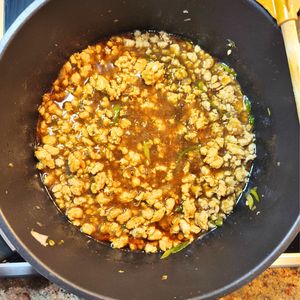 Ve středně velkém hrnci nebo hlubší pánvi rozehřejeme sezamový olej, přidáme zázvor a 2/3 jarní cibulky a necháme zpěnit. Vložíme mleté kuřecí a řádně ho opečeme.
