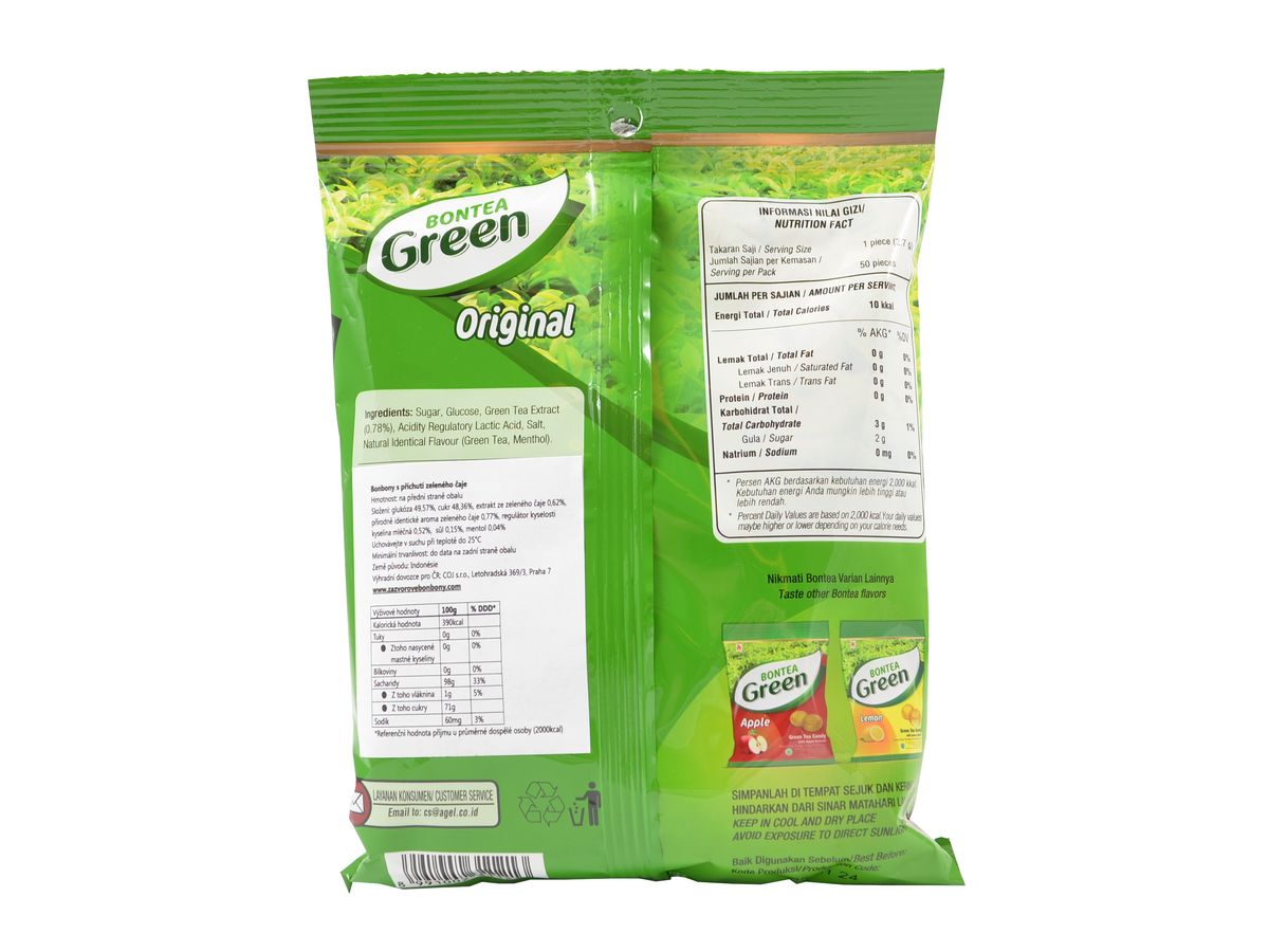 Glukóza 49,57%, cukr 43,36%, extrakt ze zeleného čaje 0,62%, přírodně identické aroma zeleného čaje 0,77 %, regulátor kyselosti kyselina mléčná 0,52%, sůl 0,15%, mentol 0,04%.