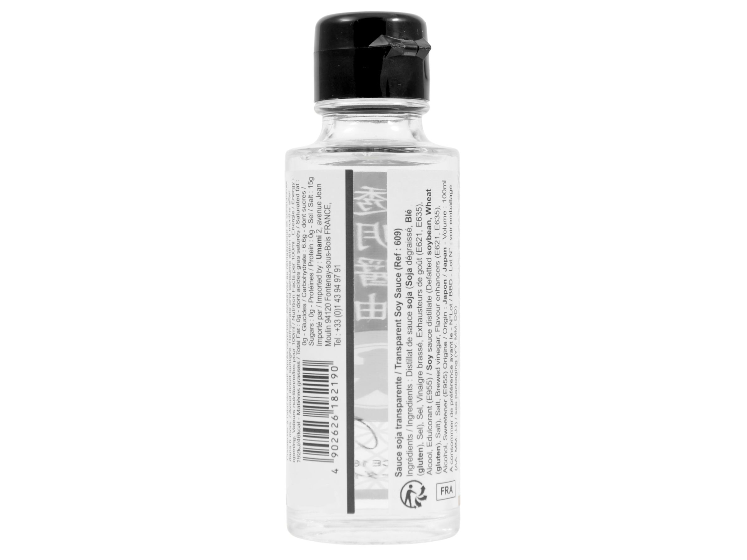 Destilát sójové omáčky (odtučněné sójové boby, pšenice, sůl), sůl, vařený ocet, zvýrazňovače chuti (E621, E635), alkohol, sladidlo (E955)