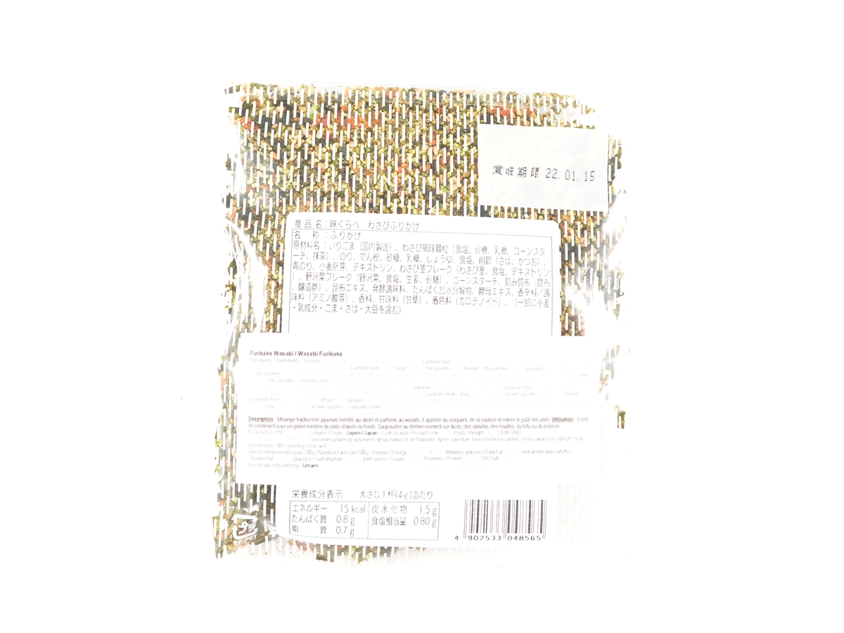 Bílý sezam, granule s příchutí wasabi (sůl, cukr, laktóza, kukuřičný škrob, matcha), nori, zvýrazňovač chuti: E621,E635, E640, E631, E627, E509, E327, škrob, cukr, laktóza, sójová omáčka (obsahuje lepek), sůl, sušené bonito a makrela, mořské řasy aonori, pšeničné klíčky, dextrin, vločky stonku wasabi a nozawana, dextrin, kukuřičný škrob, mleté kombu, ocet, extrakt z kombu, fermentované koření , koření, hydrolyzovaný protein, sladidlo (lékořice), kvasnicový extrakt, barvivo (carotenoid), bylinky.