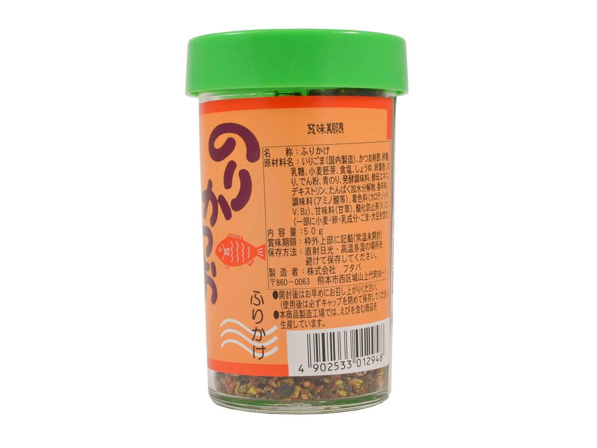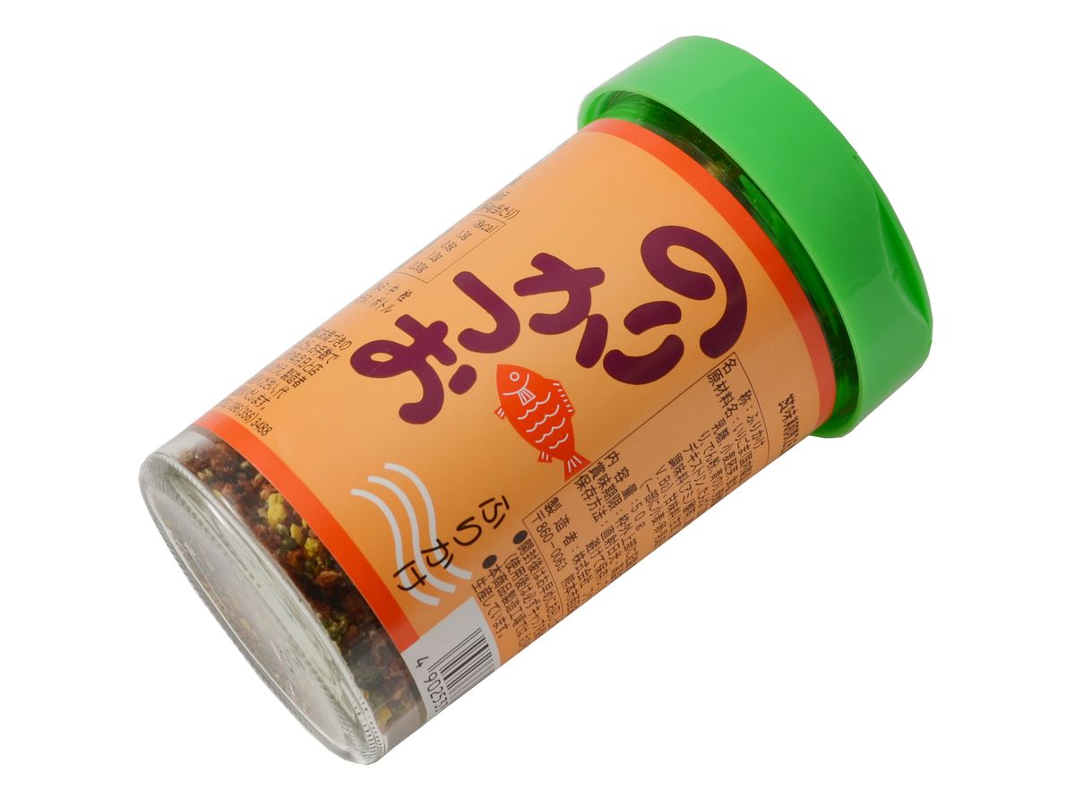 pražený bílý sezam, sušené rybí vločky 22%, cukr, laktóza, pšeničné klíčky, sůl, sójová omáčka (voda, odtučněné sójové boby, pšenice, sůl), vaječný prášek, sušené mořské řasy 3,5% (nori), škrob, zvýrazňovač chuti: E621, E635, E640, aroma, E331, E508 a E327, sušené mořské řasy (aonori) 1,5%, fermentované koření (glukózový sirup, fruktózo-glukózový sirup, cukr, rýže, sůl, koji), výtažek z kvasnic (kvasnice, maltodextrin), barvivo: E160c, E160a a E101, maltodextrin, hydrolyzovaný protein (sójové boby, kukuřice,pšenice, kvasnice), česnek, lékořice, antioxidant: E300.