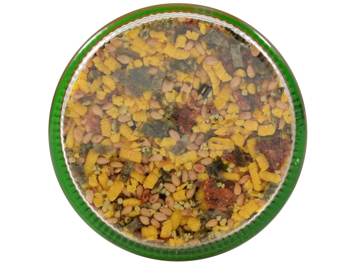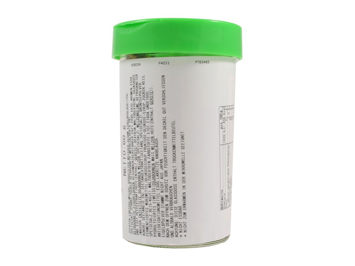 Laktóza, pražený bílý sezam, prášek z vaječného žloutku (12 %), sůl, škrob, cukr, sušené mořské řasy (4,5 %), rybí vločky, zvýrazňovače chuti: E621, E640, E635, aromata: E508 a E327, kvasnicový extrakt (droždí, maltodextrin), sójová omáčka (voda, odtučněné sójové boby, pšenice, sůl), pšeničné kvasnice, sušený prášek z mořských řas (0,5 %), extrakt z mořských řas (mořské řasy, sůl), mletý čajový prášek, fermentovaná koření (glukózový sirup, fruktózo- glukózový sirup, cukr, rýže, sůl, rýže-koji), maltodextrin, barviva: E101, E160a a E160c, hydrolyzovaný protein (sójové boby, kukuřice, pšenice, kvasnice), antioxidant: E300, lékořice, česnek.