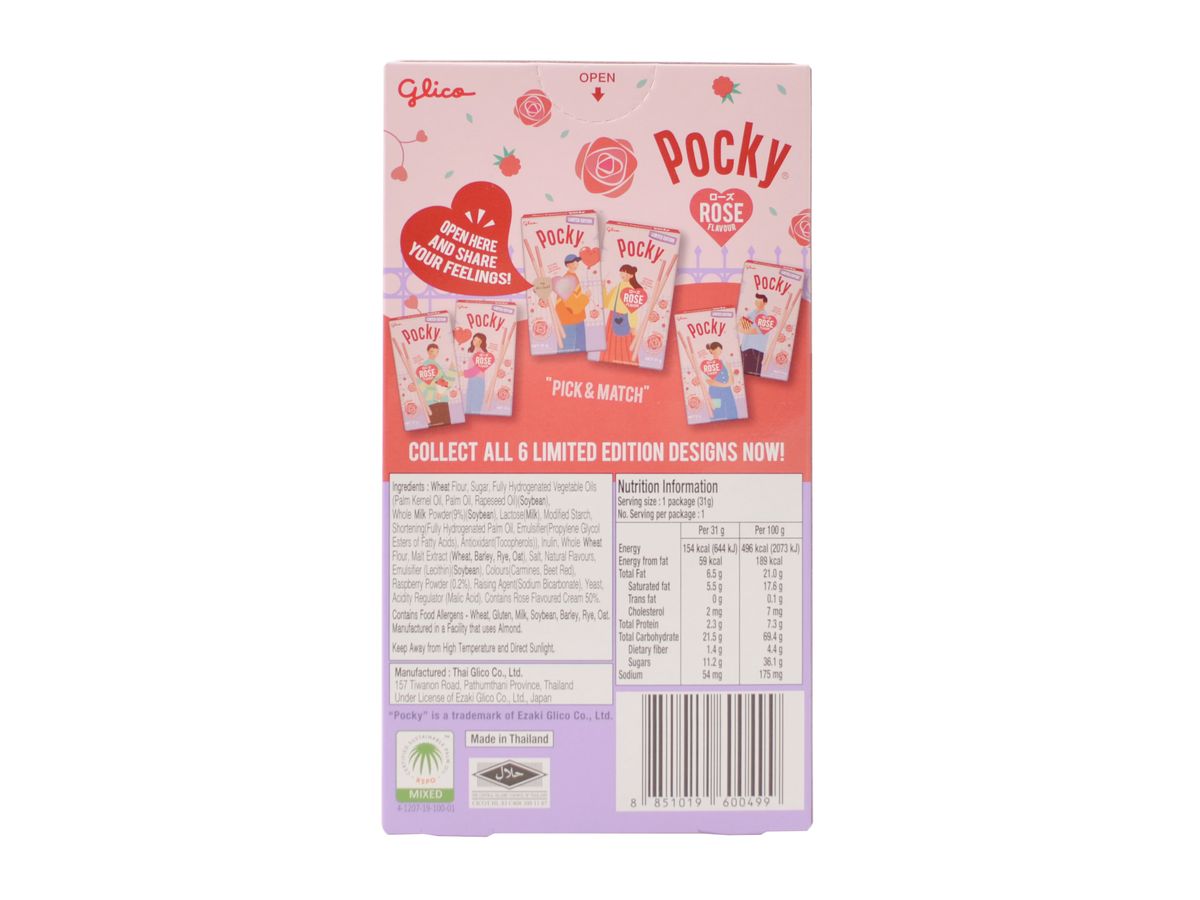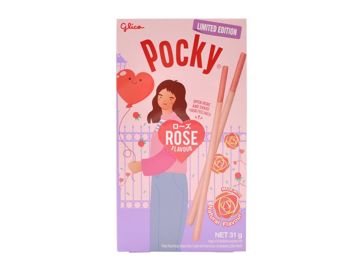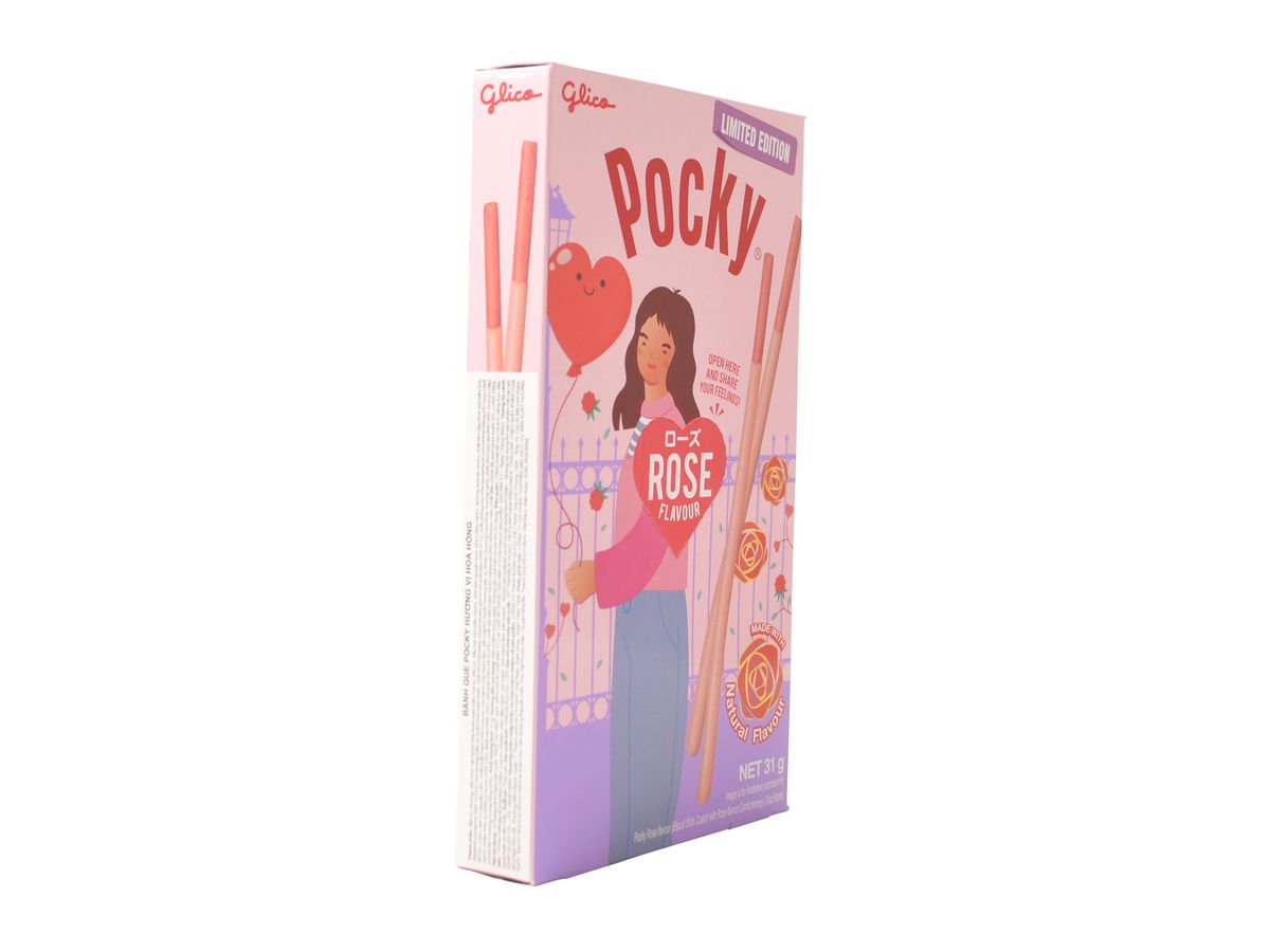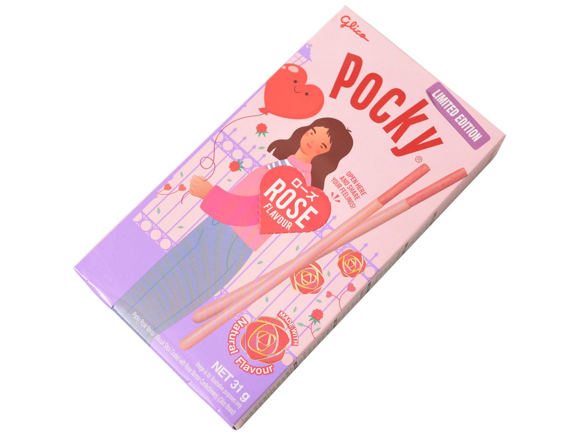 Polomáčené pšeničné tyčinky Pocky ve sladké polevě, s příchutí růží a jemnou kyselostí malin.