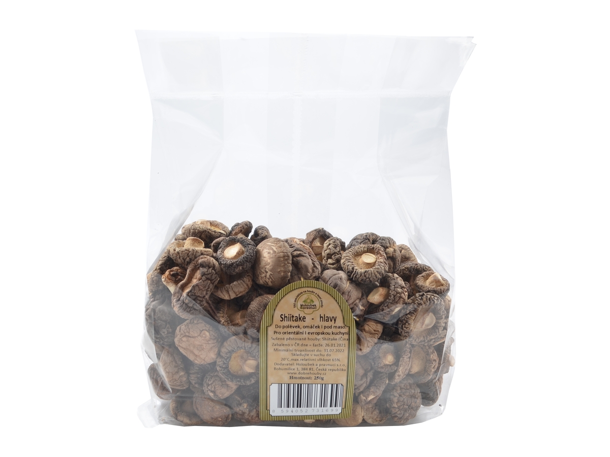 Název houby je složený ze dvou slov, „shii“ znamená dub a „take“ houba. Český název houby je houževnatec jedlý. Má hnědé vypouklé hlavičky, někdy se objevují také bílé skrnky. Průměr klouboučku bývá mezi 5 až 12 cm. Shiitake má výrazné aroma, připomínající česnek, a vynikající masitou chuť. V tomto balení nabízíme houbu shiitake v sušené podobě.