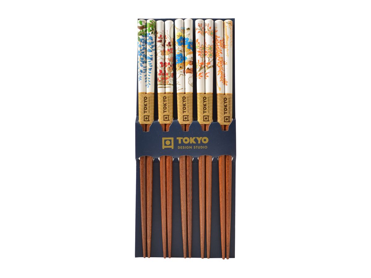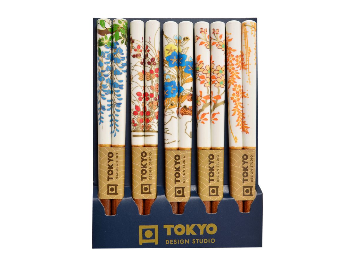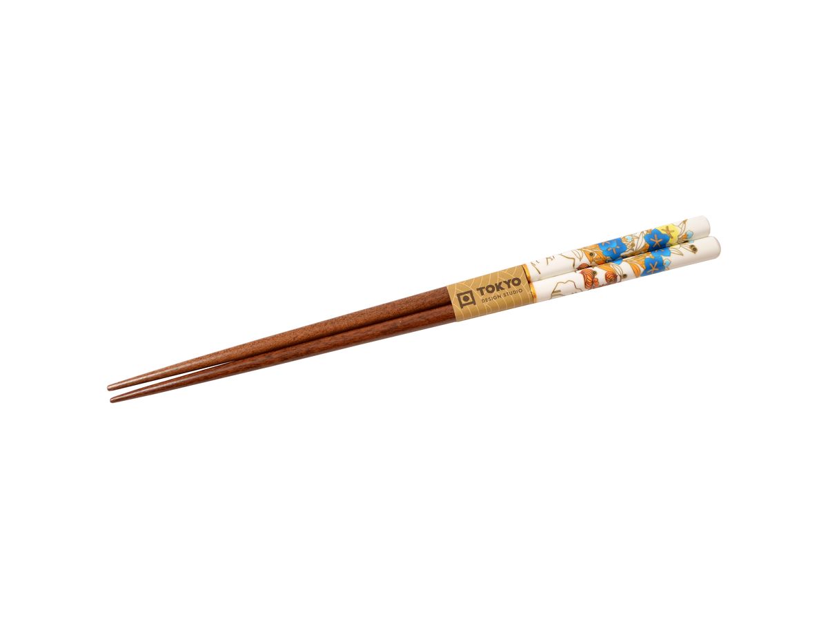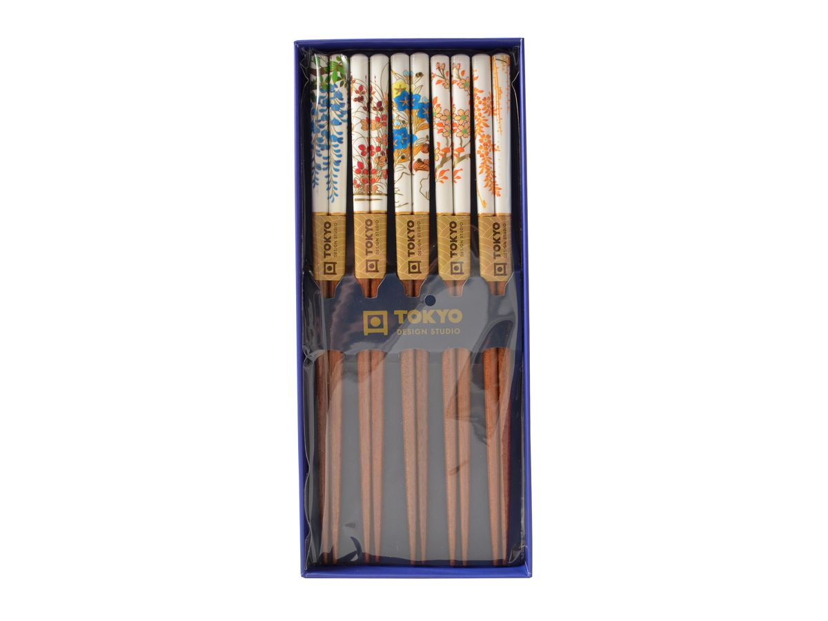 Dřevěné lakované hůlky s motivem květů v pěkné krabičce, každý pár má jiný motiv a hůlky si tak při stolování lépe rozeznáte.