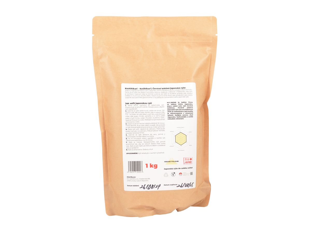 Prvotřídní japonská rýže v kilovém balení, která je pěstována na severu ostrova Honšú. Jedná se o krátkozrnnou lepkavou rýži, která je ideální na přípravu sushi, ale i jiných pokrmů nejen z japonské kuchyně. V porovnání s jinými rýžemi má Koshihikari vysoký obsah minerálů, vitamínů a vlákniny.