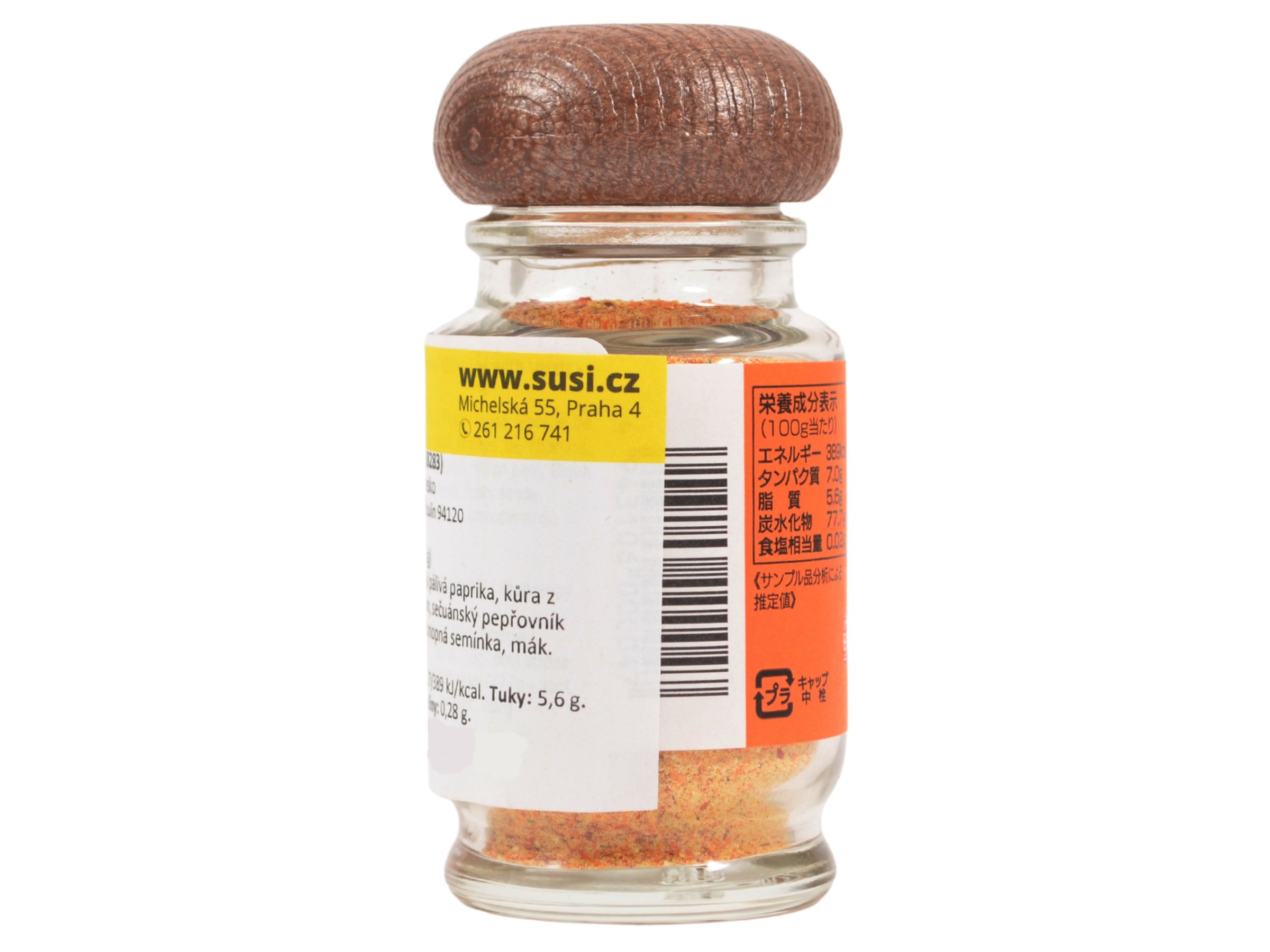 Yuzu prášek 67%, červená pálivá paprika, kůra z japonské mandarinky, černý sezam, sečuánský pepřovník (sansho), mořské řasy aonorim, konopná semínka, mák.