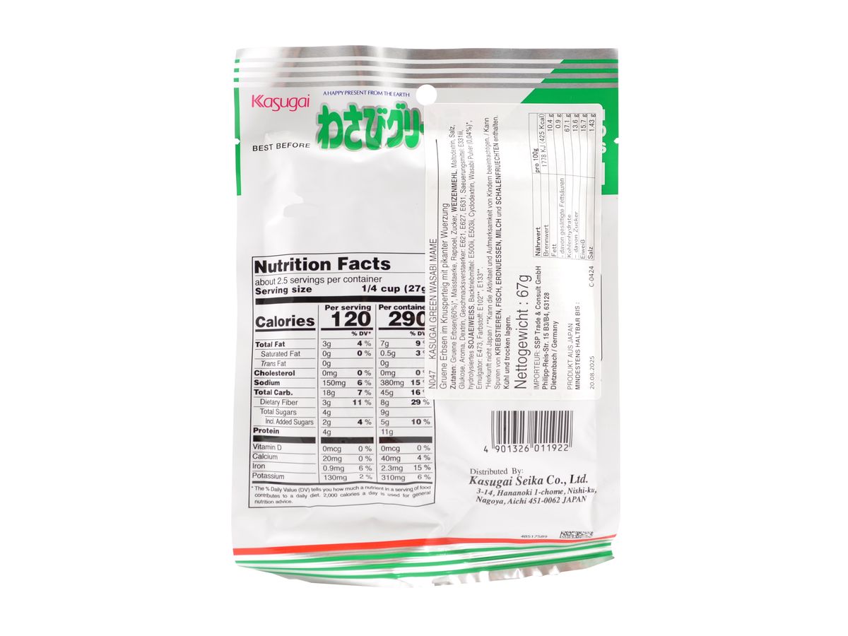 Hrášek 60 %, kukuřičný škrob, cukr, řepkový olej, pšeničná mouka, maltodextrin, aroma, dextrin, zvýrazňovač chuti: E621, E627, E631, regulátor kyselosti: E331 iii, hydrolizované sójové boby, kypřící prostředek: E500ii, E503ii, cyklodextrin, wasabi prášek (0,04%)*, emulgátor: E473, barvivo: E102**, E133**.