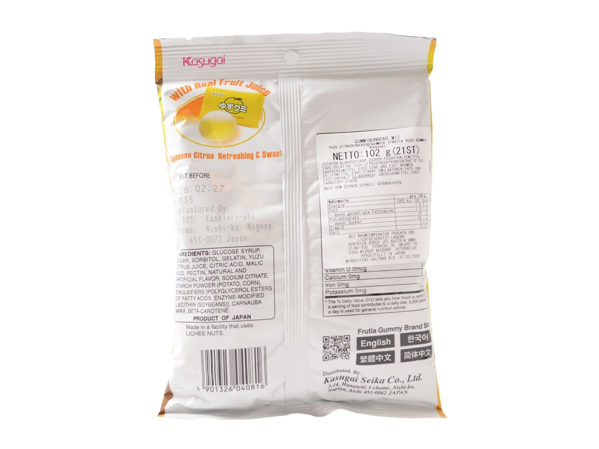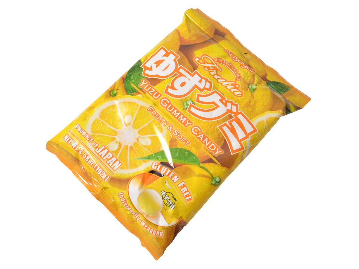 Japonské gumové bonbony s příchutí osvěžujícího citrusu yuzu, v balíčku je 21 individuálně balených bonbonků.