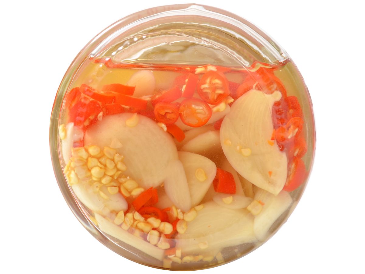 Tento nakládaný česnek s pálivými chilli papričkami, je vhodný na přípravu vietnamské polévky Pho. Využijete ho také do korejských příloh ban chan nebo k dochucení nudlí.
