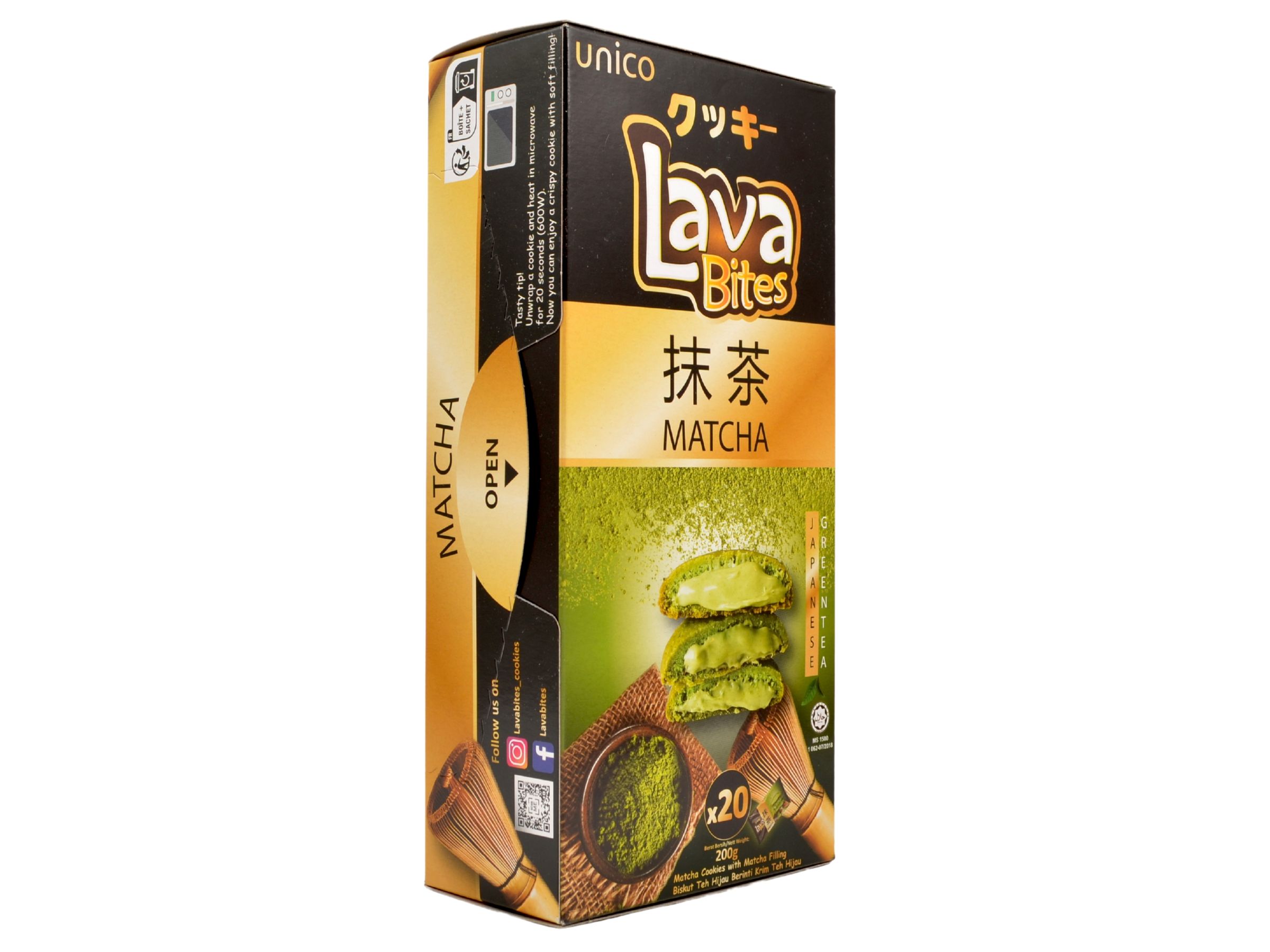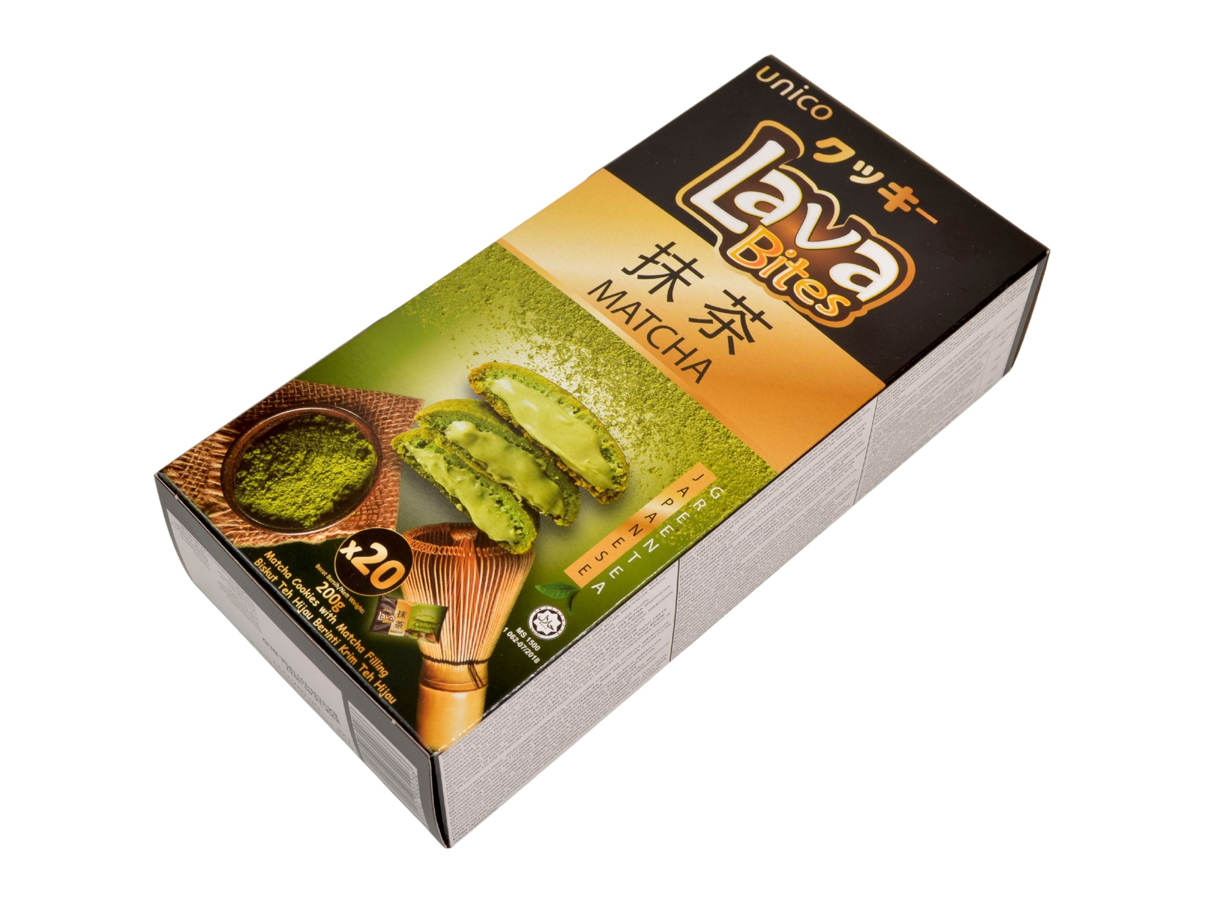 Pšeničná mouka 31%, matcha krém 37% (cukr, palmový olej, sušené mléko, matcha prášek, emulgátor E322 (sója)), palmový olej, cukr, kukuřičná mouka, vejce, máslo, sušené mléko, matcha prášek, kypřící látky E500, E503, sůl, vanilin.