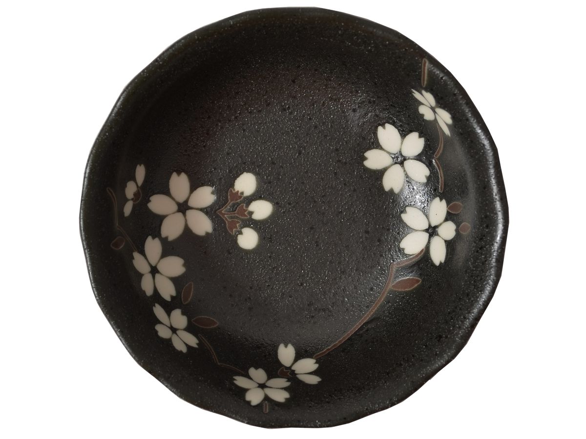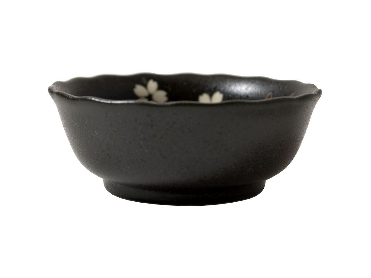 Krásná kulatá mistička na sójovou omáčku v černém matném provedení se vzorem bílých lístečků sakury. Mistička má průměr 9 cm.