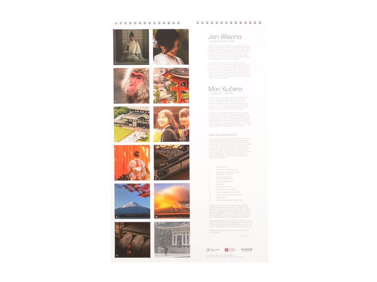 Nástěný kalendář Japan 2026, autor fotografií Jan Březina sestavil kalendář ze snímků vybraných z posledních pěti cest do Japonska. Fotografie jsou doplněny nádhernou kaligrafií od japonské umělkyně Mari Kučera, grafikou Kristýny Šťastkové a texty od Ondřeje Hýbla.