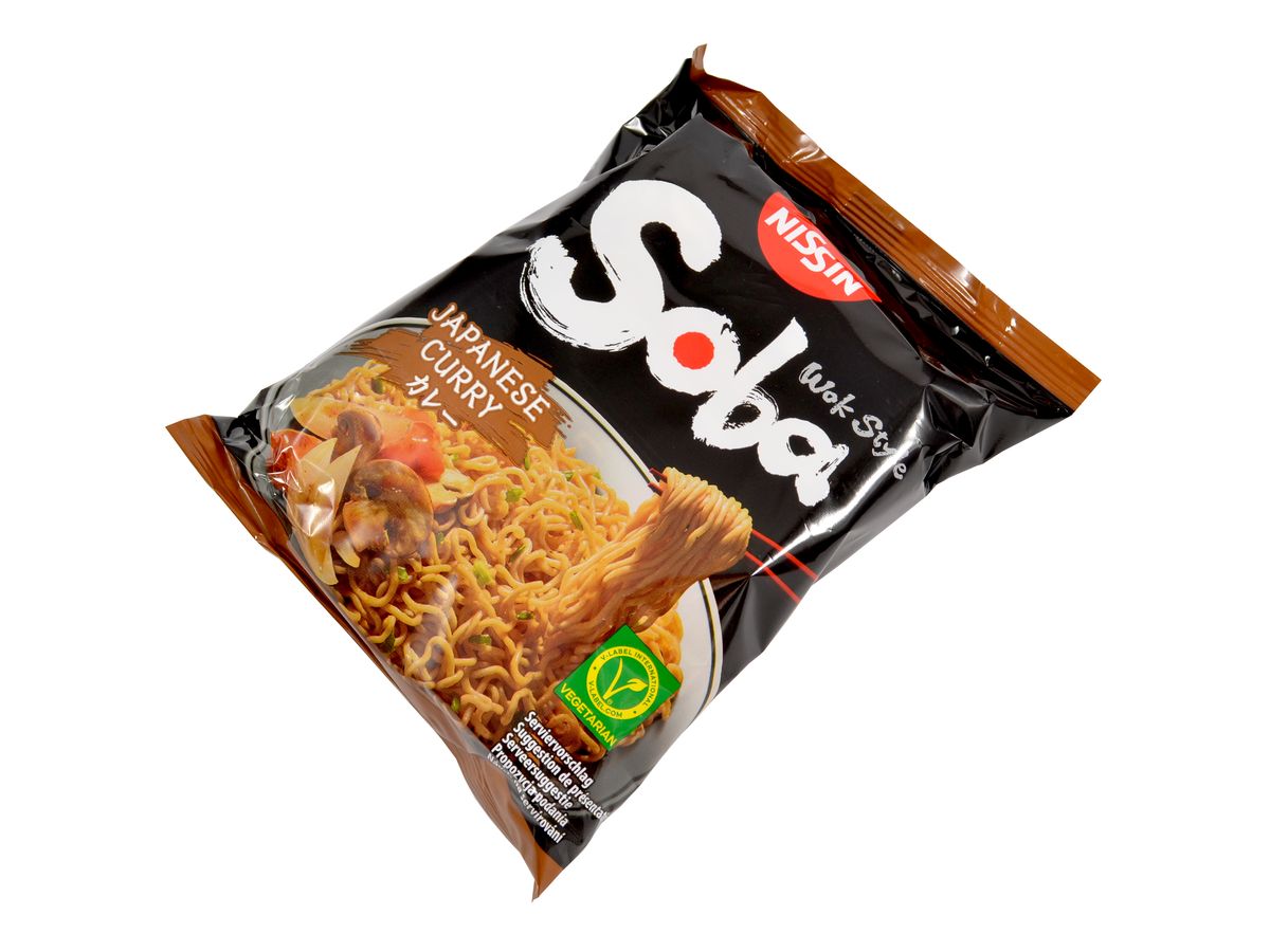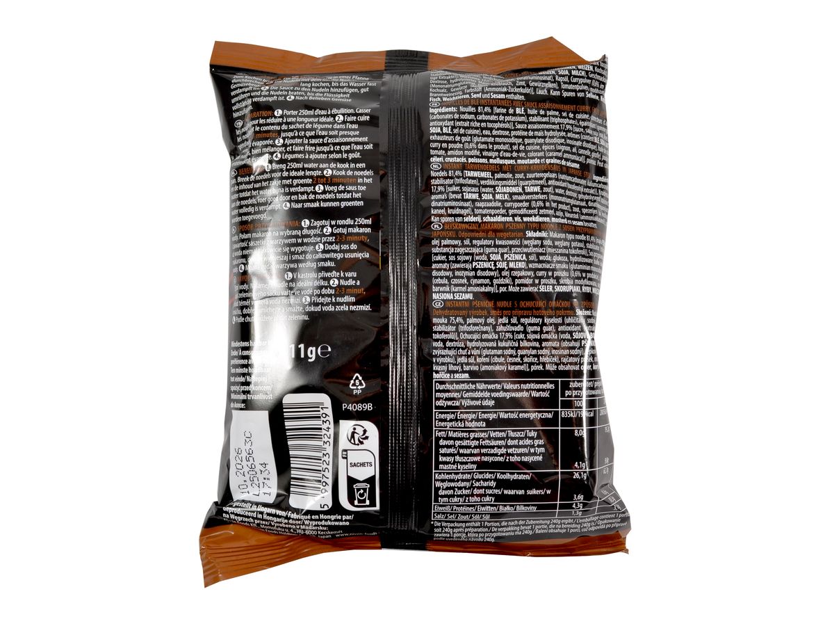 Nudle 81,4 % (pšeničná mouka 75,4 %, palmový olej, jedlá sůl, regulátory kyselosti: uhličitany sodné, uhličitany draselné, stabilizátor: trifosforečnany, zahušťovadlo: guma guar, antioxidant (extrakt s vysokým obsahem tokoferolů), ochucující omáčka 17,9 % (cukr, sójová omáčka (voda, sójové boby, pšenice, jedlá sůl), voda. dextróza, hydrolyzovaná kukuřičná bílkovina, aromata (obsahují pšenici, sóju, mléko), látka zvýrazňující chuť a vůni (glutaman sodný, guanylan sodný, inosinan sodný), řepkový olej, kari prášek )0,6% v výrobku), jedlá sůl, koření (cibule, skořice, česnek, hřebíček), rajčatový prášek, modifikovaný škrob, ocet kvasný lihový, barvivo (amoniakový karamel), pórek.