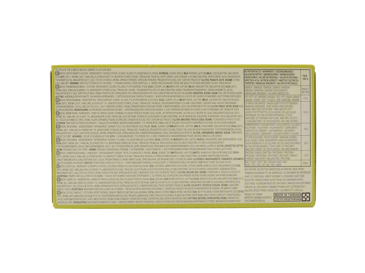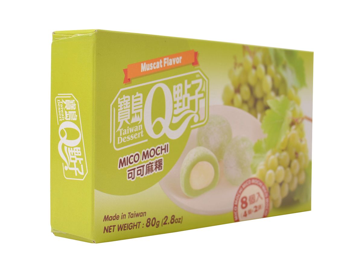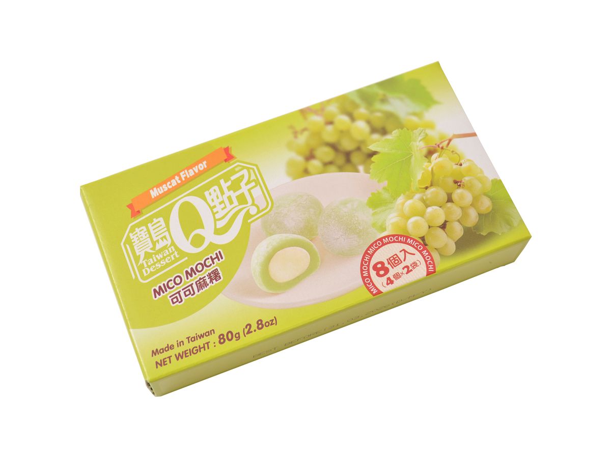 Malé rýžové mochi koláčky s příchutí hroznového vína, plněné kakaovým máslem. V krabičce je celkem 8 kousků koláčků.