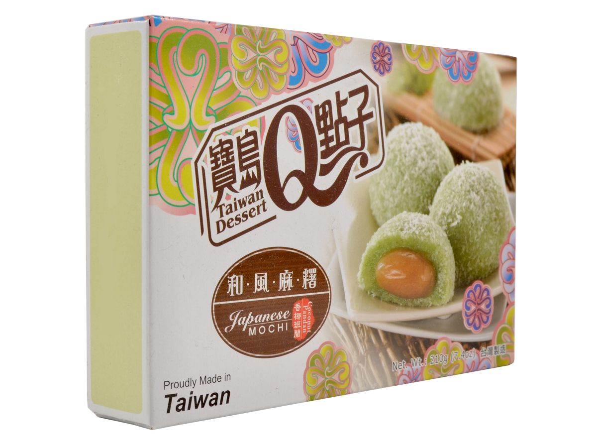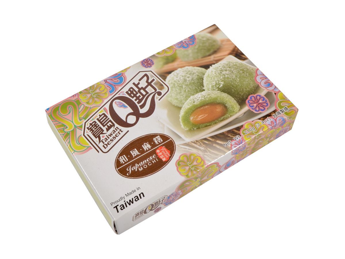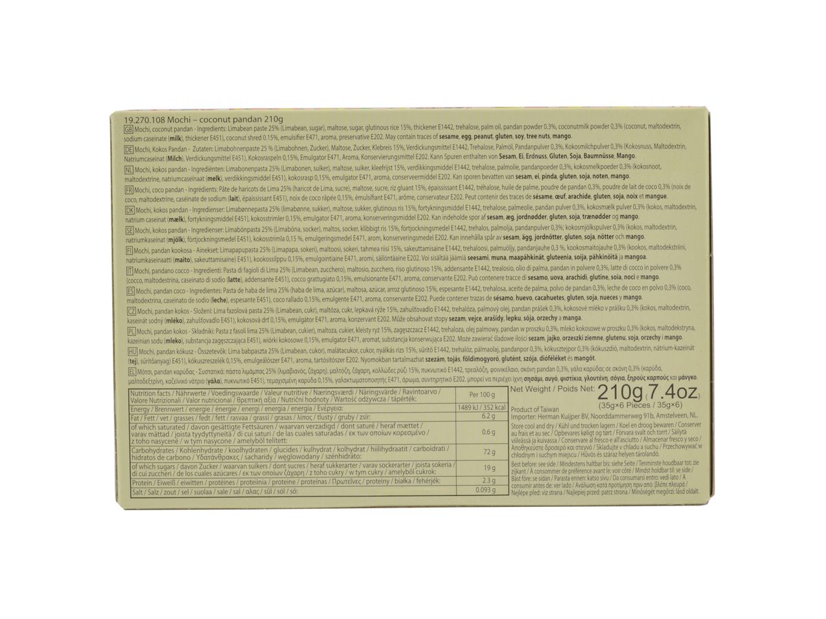 Rýžové koláčky mochi s pandan a kokosem. Pandan je tropická rostlina, která je známá svými aromatickými listy s vanilkovo, oříškovou vůní. Mochi jsou hezky balené a lze je použít i jako originální dárek a jsou určené k přímé konzumaci, nijak se nepřipravují.