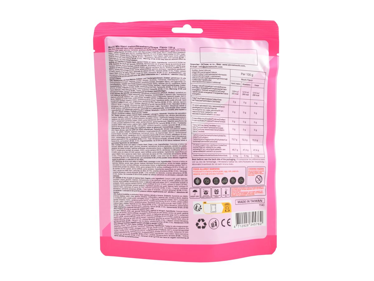 Mix mochi rýžových koláčků s náplní ve třech různých příchutích - hroznové, jahodové, hami melounu. V balíčku je celkem 8 individuálně balených mochi.
