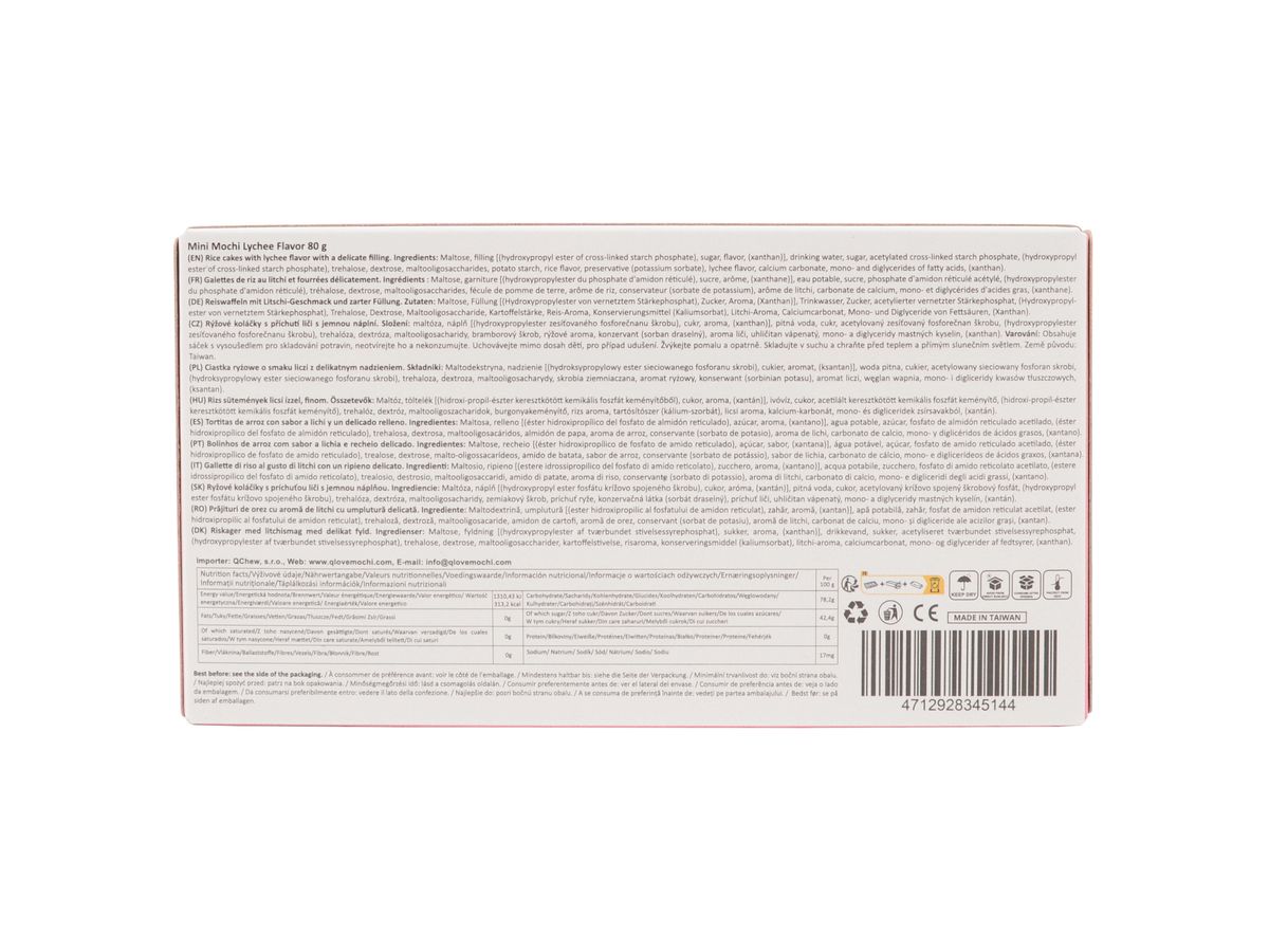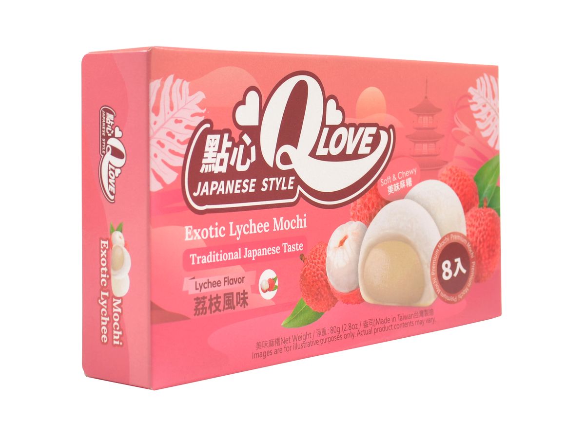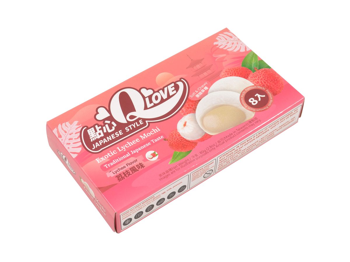 Mini koláčky mochi s náplní s příchutí exotického ovoce liči, v balení je celkem 8 koláčků.