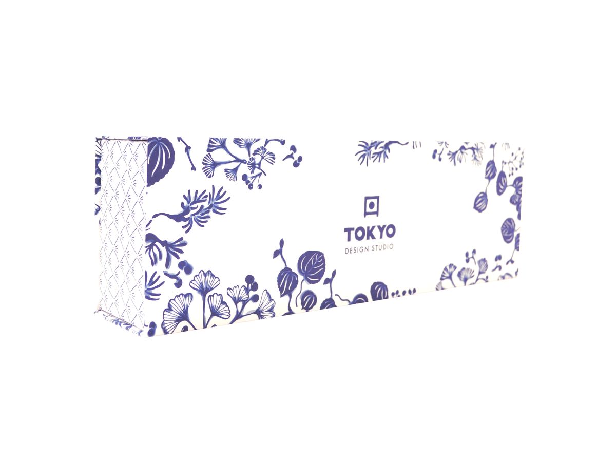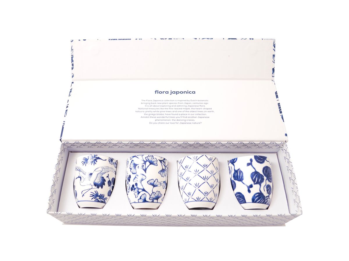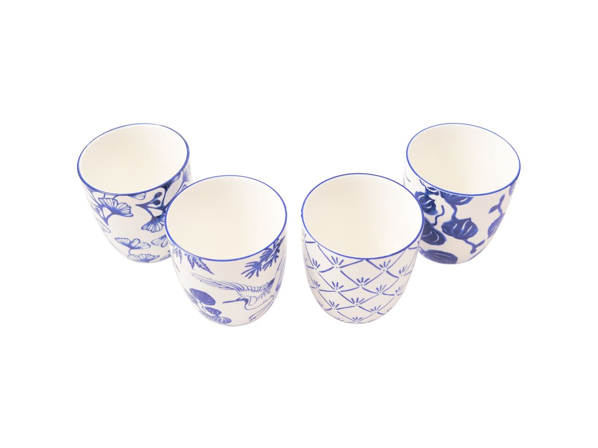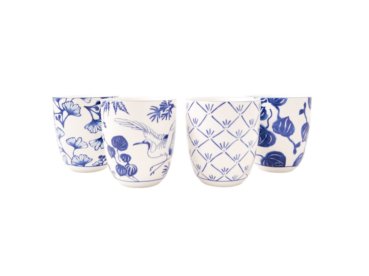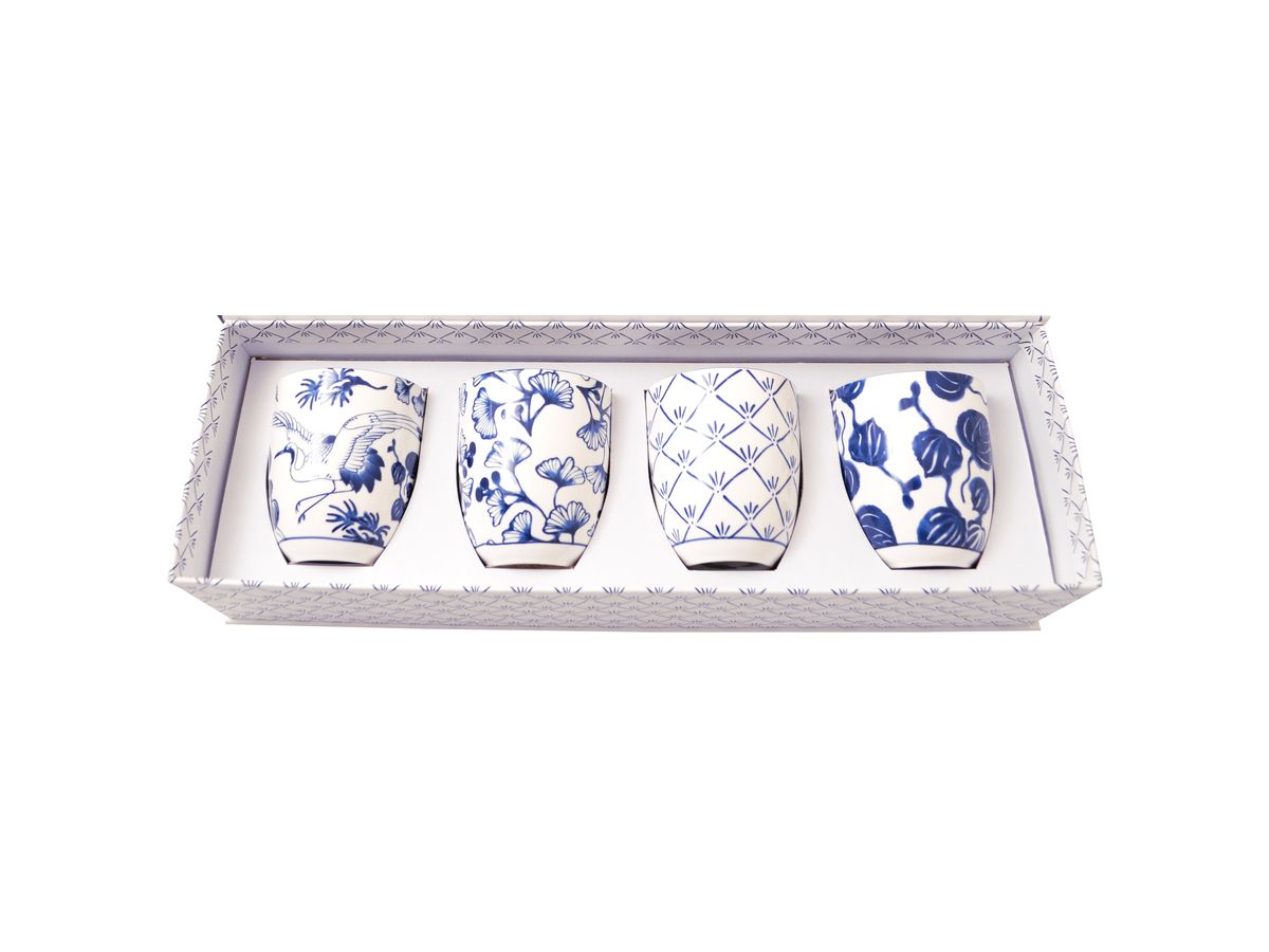 Modrobílý set čtyř hrnků se vzorem rostlin a jeřábů, hrnečky využijete na servírování čaje i kávy. Setík je dárkově balený a může být hezkým dárkem pro vaše blízké.