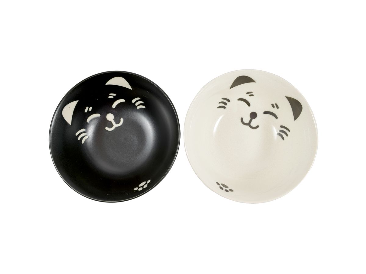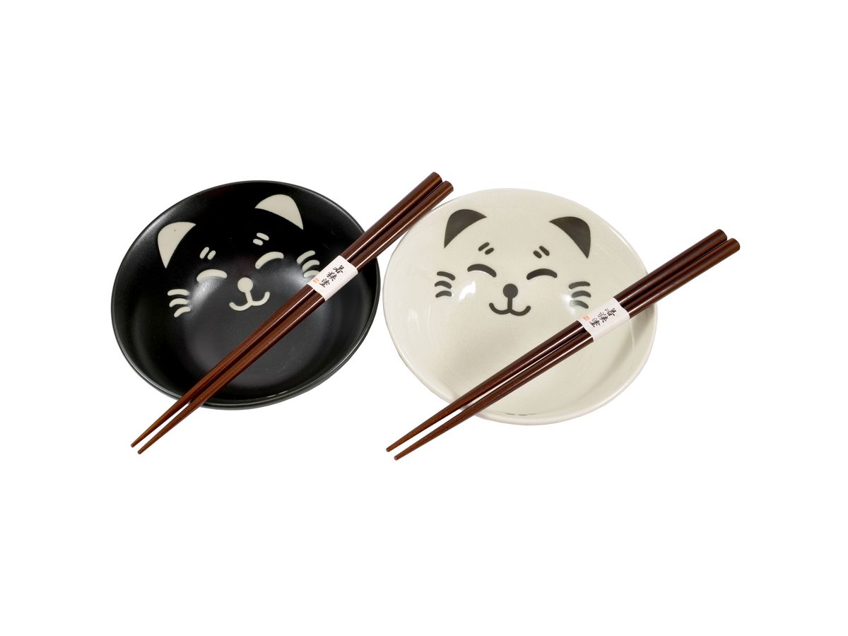 Nádherný, originál japonský set dvou misek s motivem kočky, jedna černá a druhá bílá. Součástí setu jsou i dvoje jídelní hůlky. Misky využijete k servírování nudlí, polévek nebo rýžových pokrmů.
