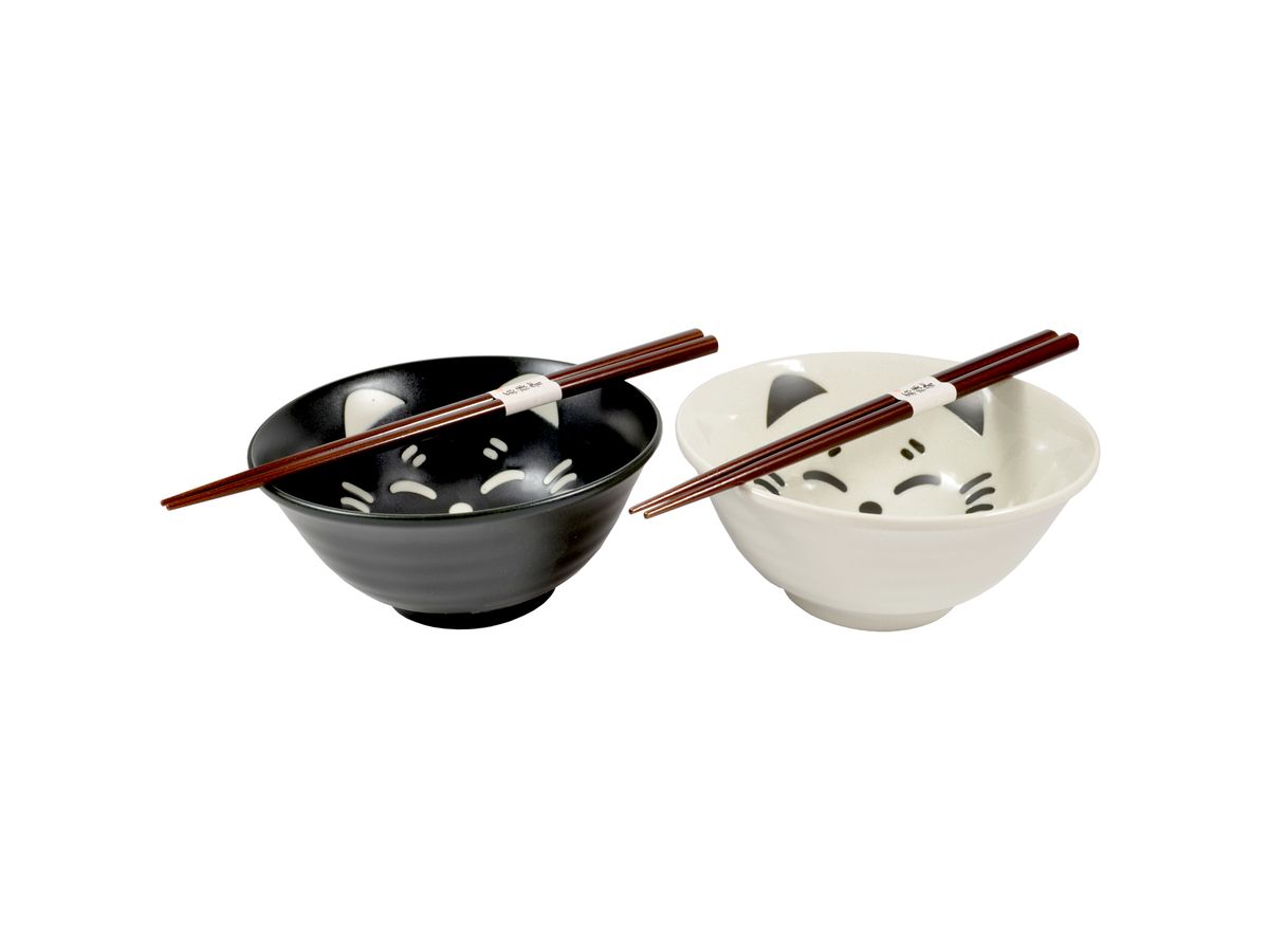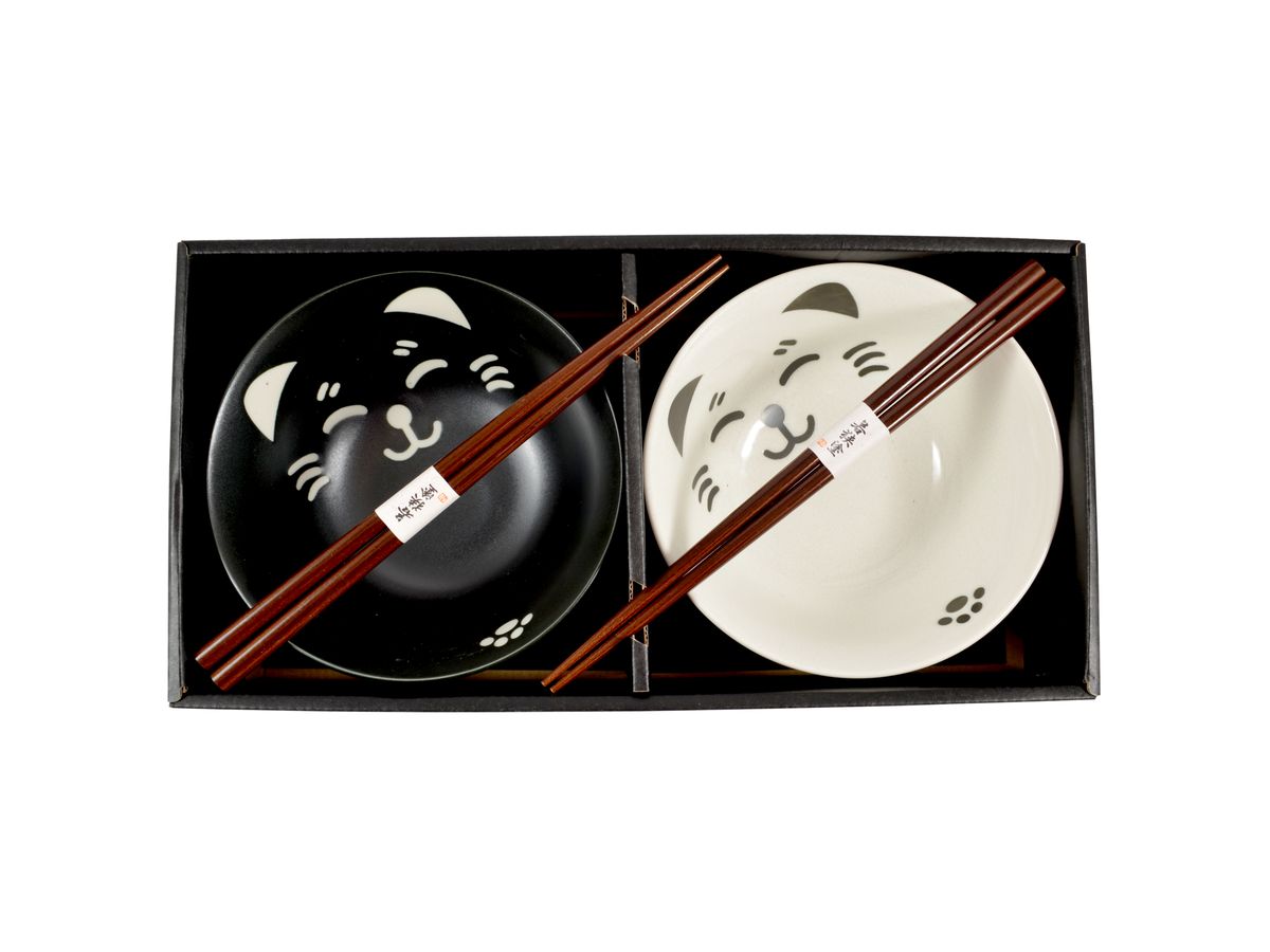 Originální japonský set dvou misek s motivem koček, v barvě černé a bílé. Set využijete k servírování nudlí, polévek nebo rýžových pokrmů. Set je balen v černé dárkové krabičce, a proto ho můžete věnovat svým přátelům a blízkým i jako dárek. Součástí setu jsou i dva páry dřevěných jídelních hůlek.