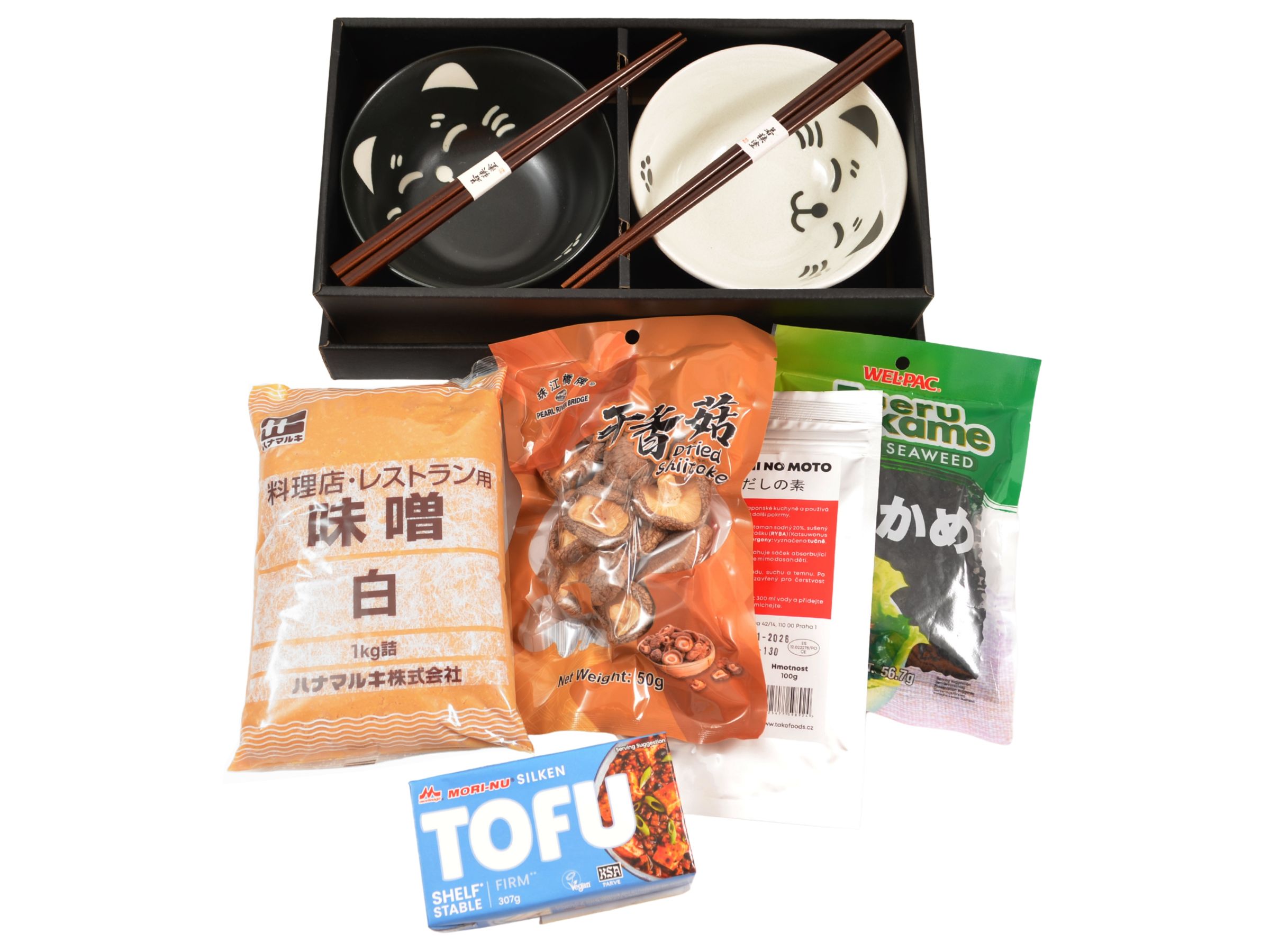 Set surovin k přípravě miso polévky obsahuje vše co k její přípravě budete potřebovat, tedy miso, tofu, řasy wakame, houby shiitake, dashi vývar a navíc úžasnou sadu dvou misek s hůlkami.
