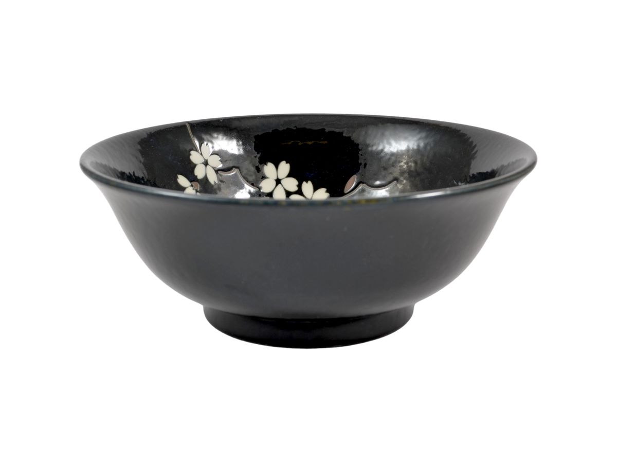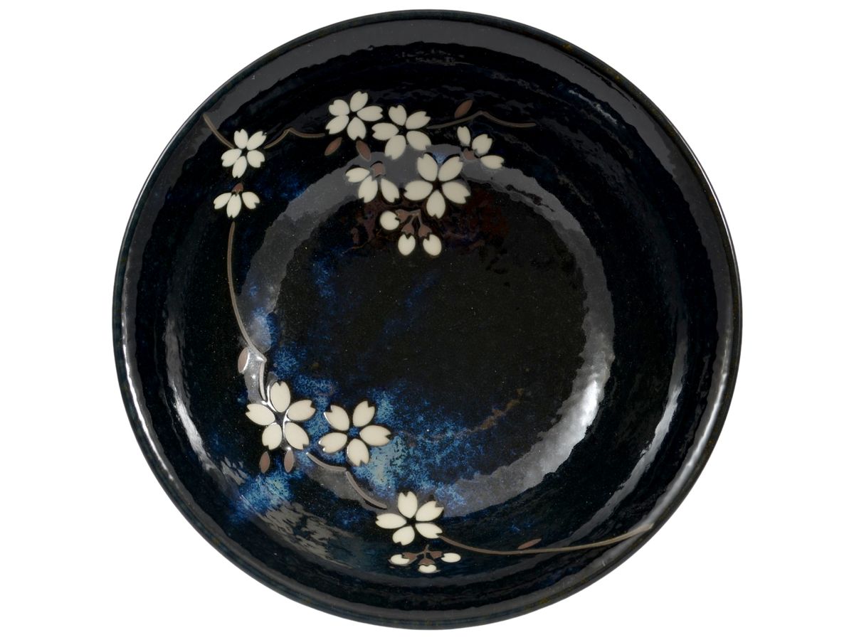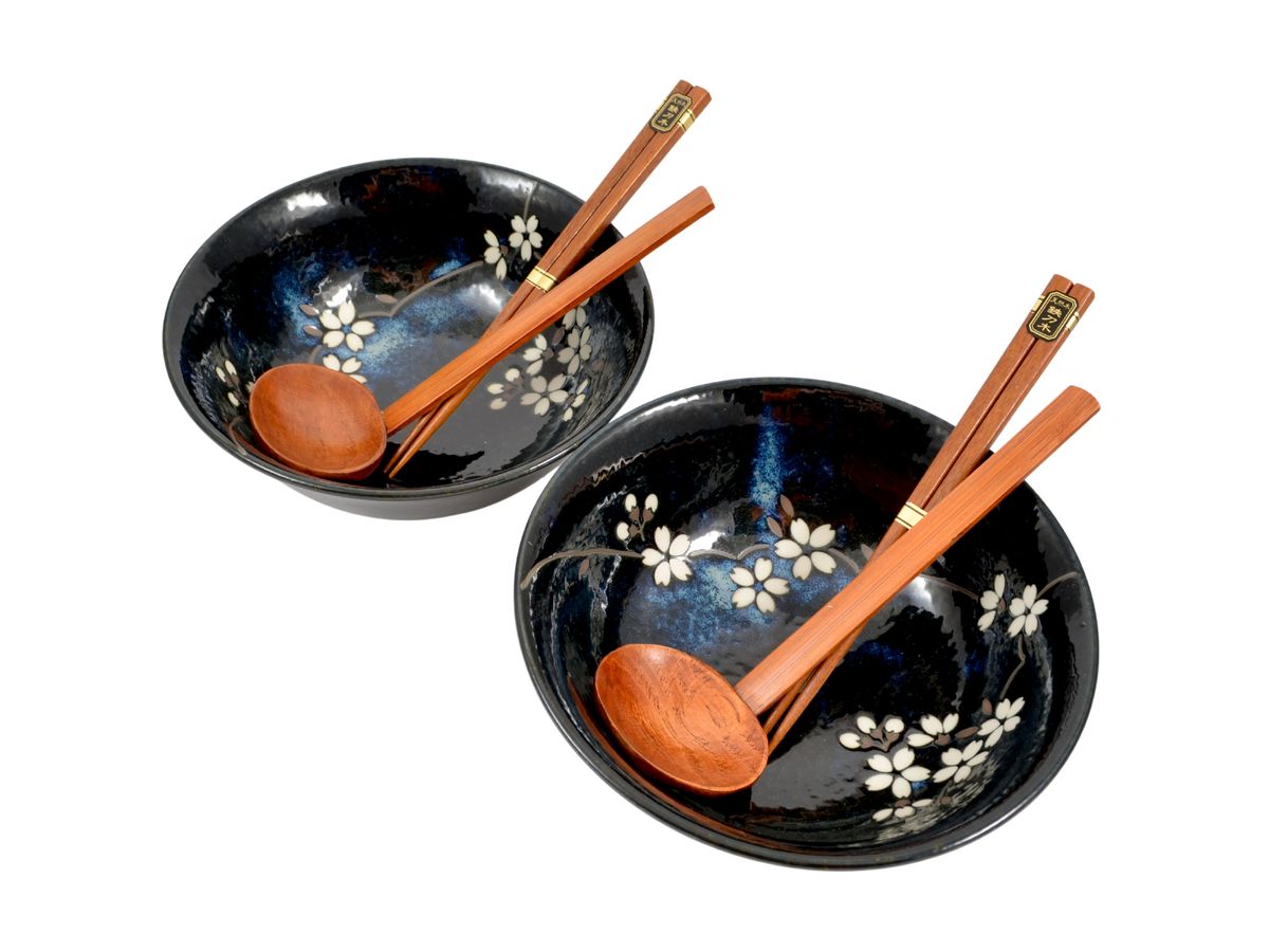 Originál japonský set na polévky ramen obsahuje dvě misky s tmavě modrým nádechem s bílými květy, dvoje jídelní hůlky a dvě lžíce.