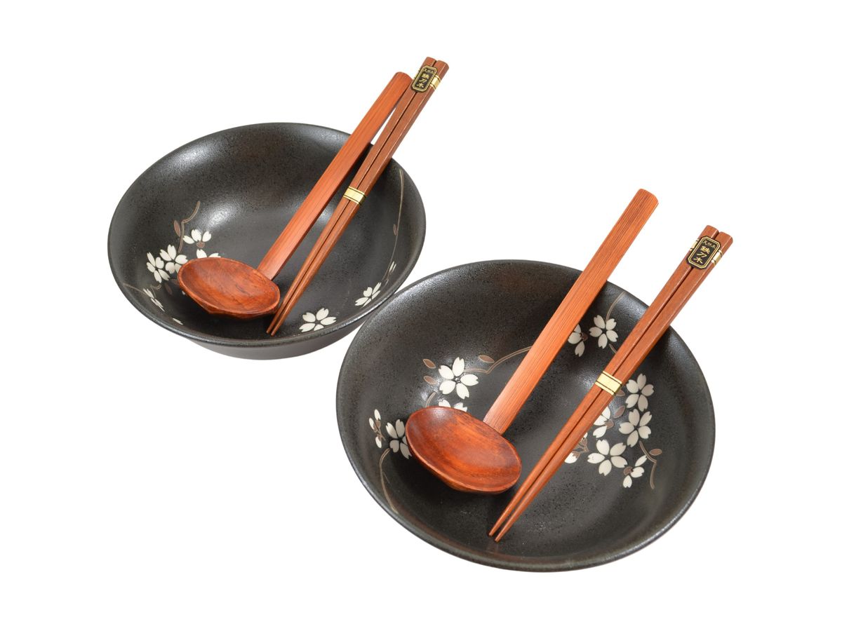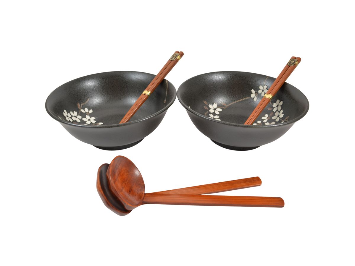 Nádherný ramen set pro dvě osoby. Má matný černý design se vzorem sakurových lístků. Set obsahuje dvoje hůlky a dvě naběračky.