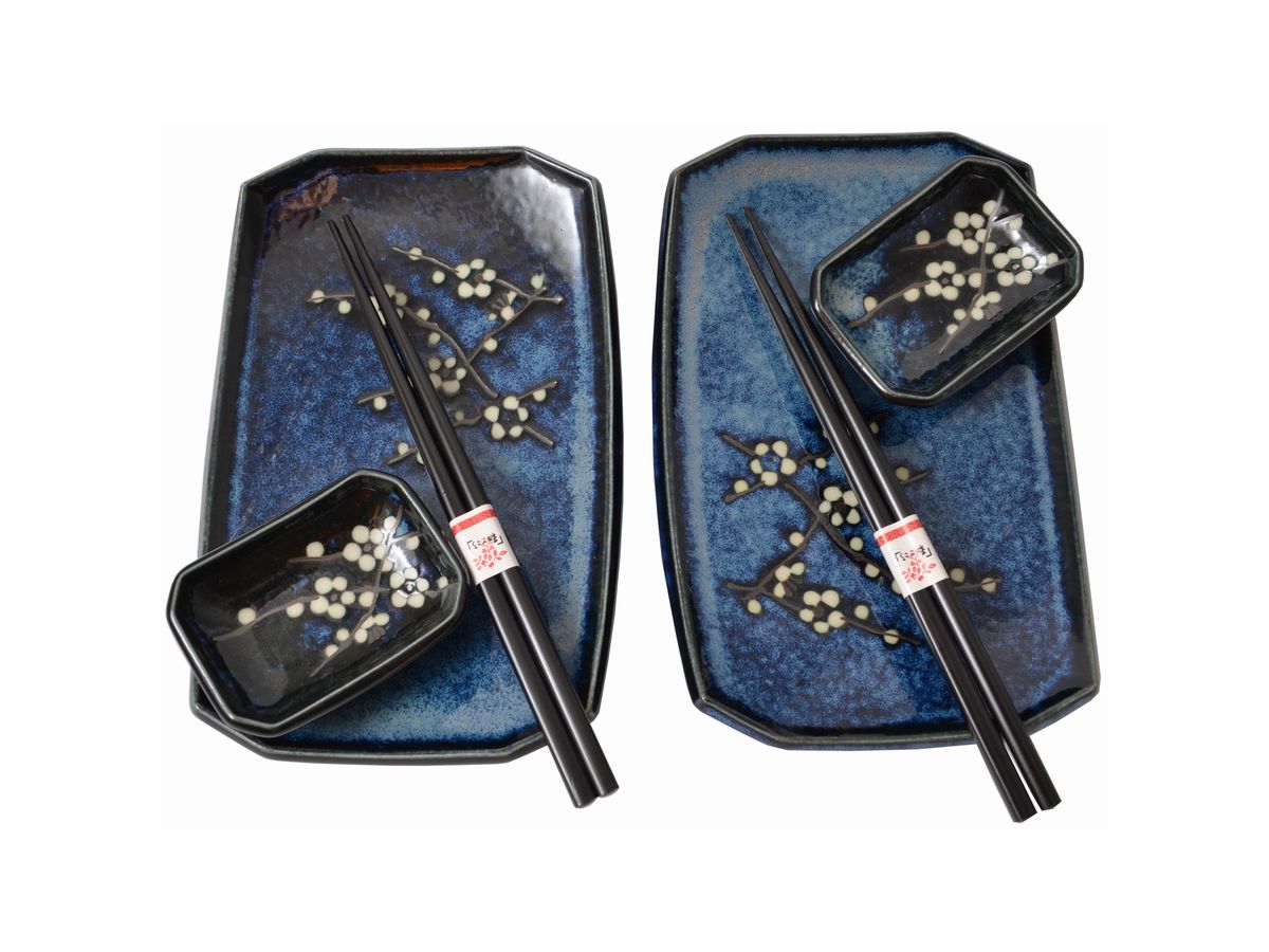 Tento krásný, originální, japonský setík obsahuje dva tácky na servírování sushi, dvě mističky na sójovou omáčku a dvoje jídelní hůlky. Velikost tácku je 22 cm x 14,5 cm a velikost mističky 8,5 cm x 6,5 cm. Barevná kombinace tmavě modré s motivem sakury působí nádherně a sushi bude na těchto táckách působit skvostně. Tento setík určitě nadchne i obdarovaného.