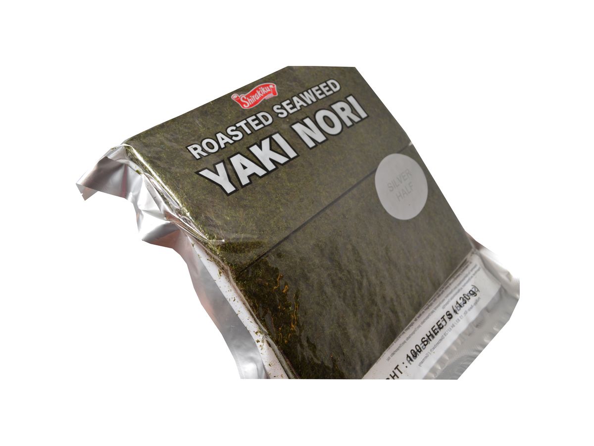 Půlené plátky mořské řasy Yaki sushi nori se používají při výrobě různých druhů sushi, nastříhanými proužky můžete převázat a ozdobit nigiri nebo dochutit další pokrmy.