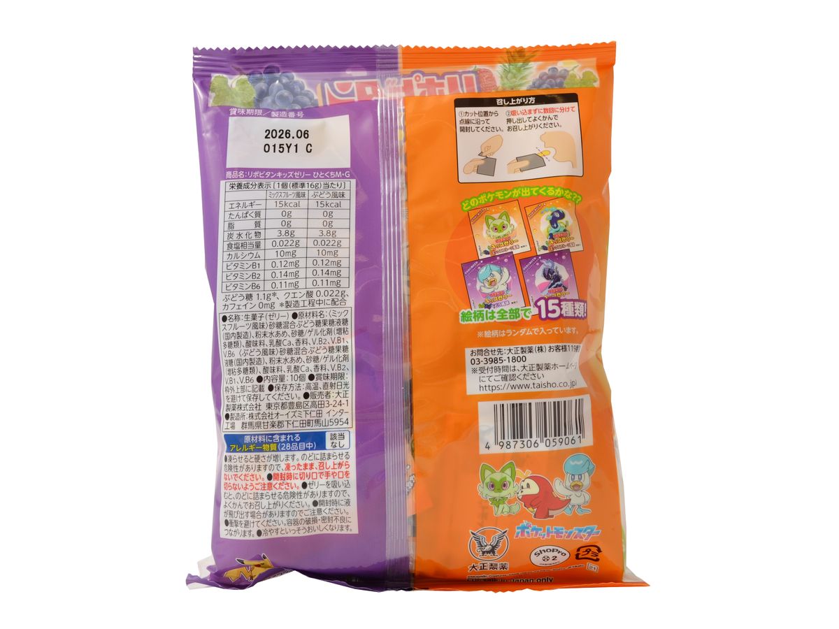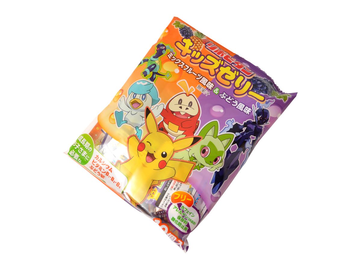 Japonské želatinky v praktických porcích, mají ovocnou příchuť hroznů a obsahují kromě vápníku, vitamin B1, B2 a B6. Balení je laděno do designu populárních pokémonů a obsahuje celkem 10 kusů.
