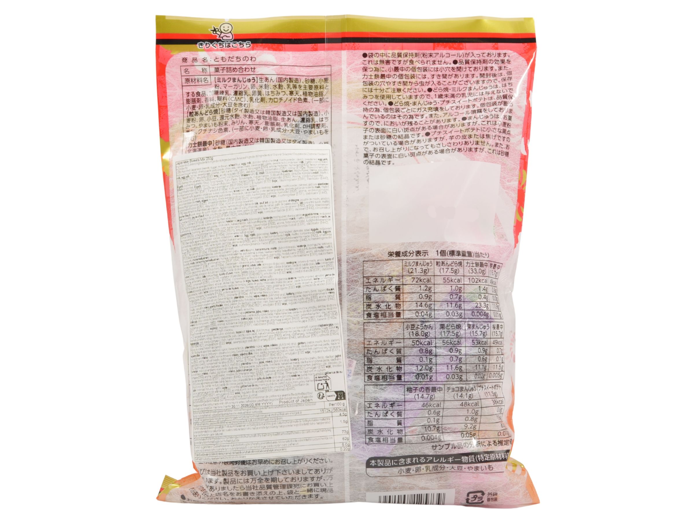 Cukr, červené fazole, pšeničná mouka, vejce, mléko, glukózový sirup, kaštany, prášek mochi, škrob, slazený žloutek, sirup se sníženým obsahem cukru, třešňová pasta, pasta yuzu, čokoláda, kakaová hmota, sladká bram borová pasta, slazené kondenzované mléko, maltol, zahuštěné mléko, vaječný žloutek, med, prášek ze sladkých brambor, mirin, želé, palmový olej, kypřící látka E500, aroma, zahušťovadlo, zvlhčující látka E420, látka zvýrazňující chuť a vůni E637, E640, E621, emulgátor E322 (sója), regulátor kyselosti: E331, stabilizátor E440, konzervant: E251, barvivo E160a.