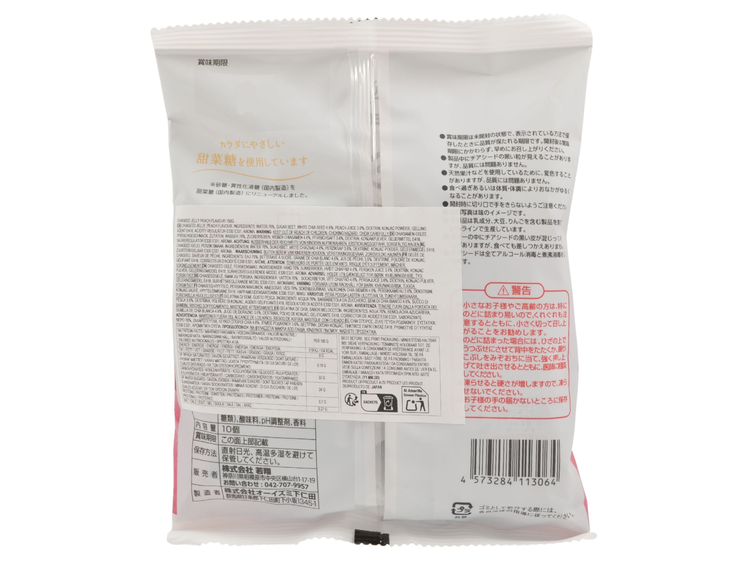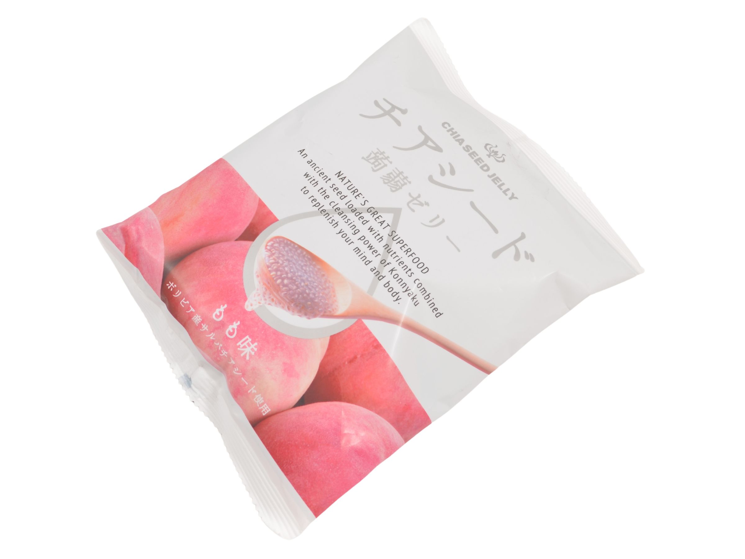 Chia Seed Konnyaku Jelly je japonské želé, které obsahuje uvnitř bílá chia semínka, broskvovou šťávu, konjakový prášek a je slazeno řepným cukrem. Jedná se o zdravou a bezlepkovou potravinu.
