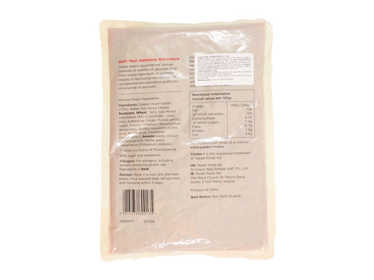 Větší kilové balení nakládané zeleniny Tsukemono je určeno pro skutečné milovníky této typické japonské přílohy. Jedná se o směs sedmi druhů zeleniny nakrájené na tenké proužky a naložené do speciálního nálevu. Fukujin zuke by nemělo chybět při servírování japonského kari.